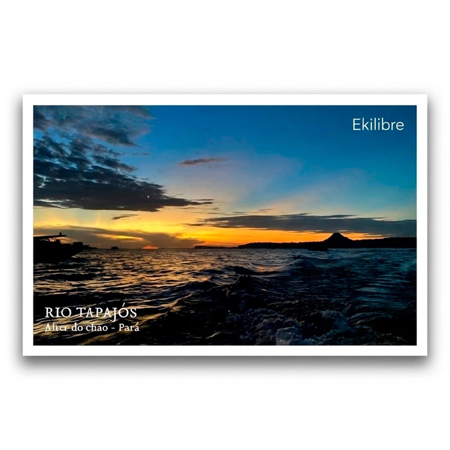 Este cartão postal registra o pôr do sol no Rio Tapajós e foi fotografado por uma pessoa da equipe Ekilibre, traduzindo um olhar autêntico e íntimo sobre a paisagem que inspira a marca diariamente. Um convite para levar consigo um fragmento da Amazônia, sua luz, sua energia e sua origem.